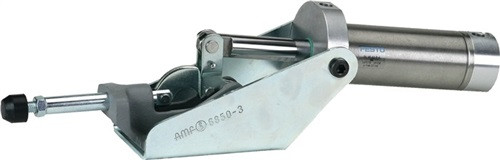 Druckspanner · schwere Ausführung für lange Lebensdauer · ausgerüstet mit doppeltwirkendem FESTO-Pneumatikzylinder mit Drosselbohrungen für gedämpfte Geschwindigkeit · (Größe N-3 mit Pneumatikzylinder mit einstellbarer Geschwindigkeit) eloxiert und anschlussfertig montiert · Größe 3 und N-3 mit Magnetkolben für Endlagenabfrage, bei den Größen 5 und 7 ist eine Endlagenabfrage nicht möglich · Werkstoff: Konsole verzinkt und passiviert, Grundkörper aus Temperguss, lackiert · Hebelteile und Schubstange aus Vergütungsstahl, verzinkt und passiviert · Niete aus nicht rostendem Stahl · Lagerstellen gefettet · komplett mit vergüteter, verzinkter Andrückschraube Nr. 6880  Hinweis: Größe N-3 mit Pneumatikzylinder aus Rechtecksprofil. Die Größen 5 und 7 weichen von der Bauform ab und haben lange Konsolen. Passenden Näherungsschalter für Endlagenabfage und Befestigungsbausatz bitte separat anfragen. ·  Weitere technische Eigenschaften A: 16mm • D: 8,5mm • Kolben-Ø: 50mm • Andrückschraube: M12 x 50 • G: 41 • HW min.: 30mm • L1: 330mm • HW max.: 50mm • H1: 96mm • F1: 10kN • L: 41mm • Bauart: Druckspanner • W: 16mm • F5: 1kN • I: M12mm • B: 98mm • Kolbenhub: 100mm • K: 45mm • R: G1/8mm • V: 80 • E: 50mm • H: 41mm • F3: 5kN • Hub: 29,6mm