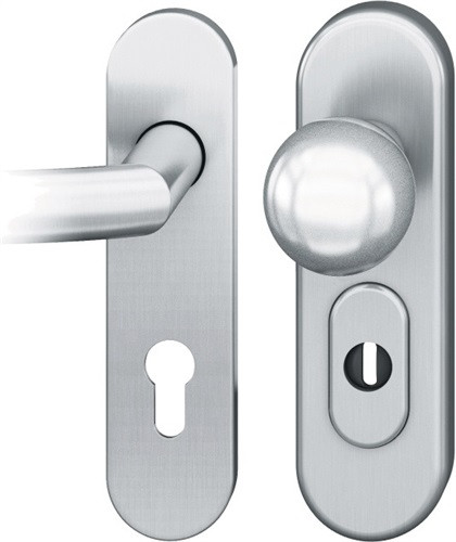 Kurzschild-Garnitur · für Außentüren · geprüft nach DIN 18257 · außen gerader Kugelknopf · innen Türgriff fest/drehbar gelagert · Drückerausführung FSB 1107 · verdeckte, durchgehende Befestigung · Lochung PZ, mit Zylinderabdeckung · Entfernung 72 mm / Vierkant 8 mm · Türstärke 67-69 mm · DIN links / rechts verwendbar · Ausführung Wechselgarnitur · Widerstandsklasse ES 1 · Weitere technische Eigenschaften Breite: 54mm • Länge: 185mm • Abdeckung: mit Zylinderabdeckung • Schildstärke: 15 mm • Farb-Nr.: 6204