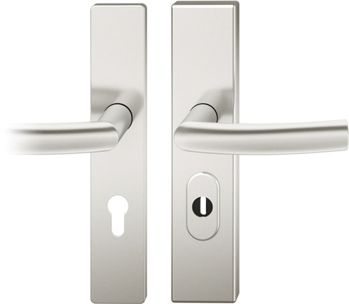 Langschild-Garnitur · für Außentüren · geprüft nach DIN 18257 · außen gekröpfter rechteckiger Flachknopf · innen Türgriff fest/drehbar gelagert · Drückerausführung FSB 1107 · verdeckte, durchgehende Befestigung · Lochung PZ, mit Zylinderabdeckung · Entfernung 72 mm / Vierkant 8 mm oder Entfernung 92 mm / Vierkant 10 mm · Türstärke 67-69 mm · DIN links / rechts verwendbar · Widerstandsklasse ES 1 · Weitere technische Eigenschaften Breite: 54mm • Länge: 246mm • Abdeckung: mit Zylinderabdeckung • Schildstärke: 15 mm • Farb-Nr.: 0105