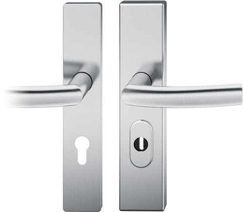 Langschild-Garnitur · für Außentüren · geprüft nach DIN 18257 · außen gekröpfter rechteckiger Flachknopf · innen Türgriff fest/drehbar gelagert · Drückerausführung FSB 1107 · verdeckte, durchgehende Befestigung · Lochung PZ, mit Zylinderabdeckung · Entfernung 72 mm / Vierkant 8 mm oder Entfernung 92 mm / Vierkant 10 mm · Türstärke 67-69 mm · DIN links / rechts verwendbar · Widerstandsklasse ES 1 · Weitere technische Eigenschaften Breite: 54mm • Länge: 246mm • Abdeckung: mit Zylinderabdeckung • Schildstärke: 15 mm • Farb-Nr.: 6204