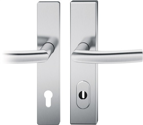 Langschild-Garnitur · für Außentüren · geprüft nach DIN 18257 · außen gekröpfter rechteckiger Flachknopf · innen Türgriff fest/drehbar gelagert · Drückerausführung FSB 1107 · verdeckte, durchgehende Befestigung · Lochung PZ, mit Zylinderabdeckung · Entfernung 72 mm / Vierkant 8 mm oder Entfernung 92 mm / Vierkant 10 mm · Türstärke 67-69 mm · DIN links / rechts verwendbar · Widerstandsklasse ES 1 · Weitere technische Eigenschaften Breite: 54mm • Länge: 246mm • Abdeckung: mit Zylinderabdeckung • Schildstärke: 15 mm • Farb-Nr.: 6204
