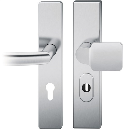 Langschild-Garnitur · für Außentüren · geprüft nach DIN 18257 · außen gekröpfter rechteckiger Flachknopf · innen Türgriff fest/drehbar gelagert · Drückerausführung FSB 1107 · verdeckte, durchgehende Befestigung · Lochung PZ, mit Zylinderabdeckung · Entfernung 72 mm / Vierkant 8 mm oder Entfernung 92 mm / Vierkant 10 mm · Türstärke 67-69 mm · DIN links / rechts verwendbar · Widerstandsklasse ES 1 · Weitere technische Eigenschaften Breite: 54mm • Länge: 246mm • Abdeckung: mit Zylinderabdeckung • Schildstärke: 15 mm • Farb-Nr.: 6204