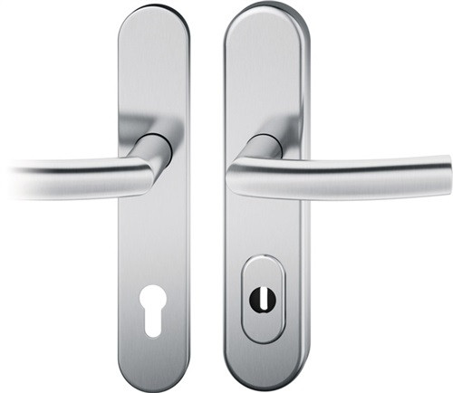Langschild-Garnitur · für Außentüren · geprüft nach DIN 18257 · außen gekröpfter runder Flachknopf · innen Türgriff fest/drehbar gelagert · Drückerausführung FSB 1107 · verdeckte, durchgehende Befestigung · Lochung PZ, mit Zylinderabdeckung · Entfernung 72 mm / Vierkant 8 mm oder Entfernung 92 mm / Vierkant 10 mm · Türstärke 67-69 mm · DIN links / rechts verwendbar · Widerstandsklasse ES 1 · Weitere technische Eigenschaften Breite: 54mm • Länge: 246mm • Abdeckung: mit Zylinderabdeckung • Schildstärke: 15 mm • Farb-Nr.: 6204
