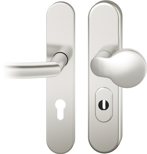 Langschild-Garnitur · für Außentüren · geprüft nach DIN 18257 · außen gekröpfter runder Flachknopf · innen Türgriff fest/drehbar gelagert · Drückerausführung FSB 1107 · verdeckte, durchgehende Befestigung · Lochung PZ, mit Zylinderabdeckung · Entfernung 72 mm / Vierkant 8 mm oder Entfernung 92 mm / Vierkant 10 mm · Türstärke 67-69 mm · DIN links / rechts verwendbar · Widerstandsklasse ES 1 · Weitere technische Eigenschaften Breite: 54mm • Länge: 246mm • Abdeckung: mit Zylinderabdeckung • Schildstärke: 15 mm • Farb-Nr.: 0105