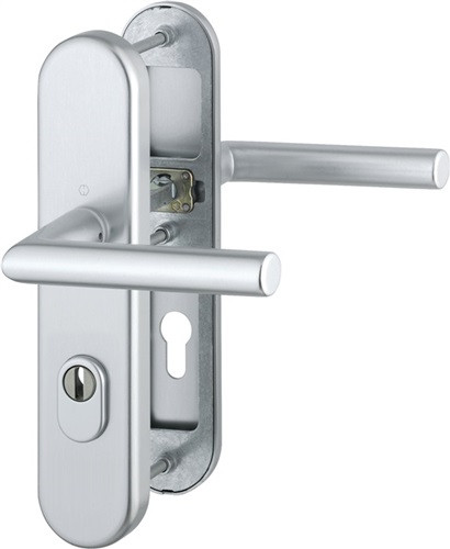 für Abschlusstüren · einbruchhemmend nach DIN 18257 · Stahl-Unterkonstruktion im Außen- und Innenschild · mit Rückholfeder-Paket · Zylinder-Abdeckung aus gehärtetem Stahl für vorstehende Zylinderlänge 10-18 mm · innen: loser Türgriff, mit Schnellstift-Verbindung · hochfeste, verdeckte Verschraubung · Knopfschild-Randhöhe: 15 mm · Wechselgarnitur · Lochung PZ · DIN links / rechts verwendbar · einschließlich Befestigungsmaterial · Widerstandsklasse ES 1 · Weitere technische Eigenschaften Breite: 54mm • Länge: 250mm • Abdeckung: mit Zylinderabdeckung • Schildstärke: 15 mm • Farb-Nr.: F1