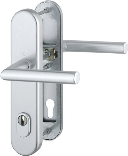 für Abschlusstüren · einbruchhemmend nach DIN 18257 · Stahl-Unterkonstruktion im Außen- und Innenschild · mit Rückholfeder-Paket · Zylinder-Abdeckung aus gehärtetem Stahl für vorstehende Zylinderlänge 10-18 mm · innen: loser Türgriff, mit Schnellstift-Verbindung · hochfeste, verdeckte Verschraubung · Knopfschild-Randhöhe: 15 mm · Wechselgarnitur · Lochung PZ · DIN links / rechts verwendbar · einschließlich Befestigungsmaterial · Widerstandsklasse ES 1 · Weitere technische Eigenschaften Breite: 54mm • Länge: 250mm • Abdeckung: mit Zylinderabdeckung • Schildstärke: 15 mm • Ergänzung: abgesetzter Vierkant • Farb-Nr.: F1