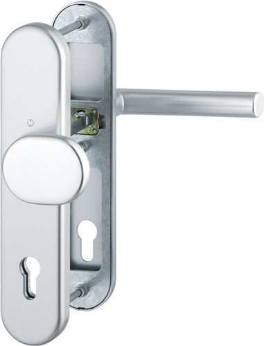 für Abschlusstüren · geprüft nach DIN 18257 · Stahl-Unterkonstruktion im Außen- und Innenschild · mit Rückholfeder-Paket · Wechselgarnituren mit gekröpftem Knopf · feststehend (ummontierbar) · mit Schnellstift-Verbindung · hochfeste, verdeckte Verschraubung · Lochung PZ · DIN links / rechts verwendbar · einschließlich Befestigungsmaterial M 6 · Widerstandsklasse ES 1 · Weitere technische Eigenschaften Breite: 54mm • Länge: 250mm • Abdeckung: ohne Zylinderabdeckung • Schildstärke: 12 mm • Ergänzung: abgesetzter Vierkant • Farb-Nr.: F1