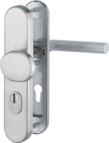 für Abschlusstüren · einbruchhemmend nach DIN 18257 · Stahl-Unterkonstruktion im Außen- und Innenschild · mit Rückholfeder-Paket · Zylinder-Abdeckung aus gehärtetem Stahl für vorstehende Zylinderlänge 10-18 mm · innen: loser Türgriff · mit Schnellstift-Verbindung · hochfeste, verdeckte Verschraubung · Knopfschild-Randhöhe: 15 mm · Lochung PZ · DIN links und rechts verwendbar · einschließlich Befestigungsmaterial · Widerstandsklasse ES 1 · Weitere technische Eigenschaften Breite: 54mm • Länge: 250mm • Abdeckung: mit Zylinderabdeckung • Schildstärke: 15 mm • Farb-Nr.: F69