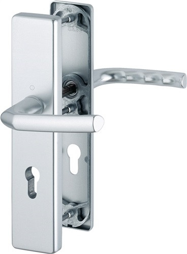 für Abschlusstüren · Zamak-Unterkonstruktion im Außen- und Innenschild · HOPPE FDW Profilstift-Verbindung · sichtbare Verschraubung · Lochung PZ · einschließlich Befestigungsmaterial M 6 · Aussenschild Randhöhe 12 mm · Drückergarnitur · DIN links / rechts · Widerstandsklasse ES 0 · Weitere technische Eigenschaften Breite: 54mm • Länge: 250mm • Abdeckung: ohne Zylinderabdeckung • Schildstärke: 12 mm • Farb-Nr.: F1