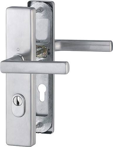 für Abschlusstüren · geprüft nach DIN 18257 · Stahl-Unterkonstruktion im Außen- und Innenschild · mit Rückholfeder-Paket · mit feststehendem Knopf · ZA aus gehärtetem Stahl für vorstehende Zylinderlänge 10-18 mm · mit Schnellstiftverbindung · hochfeste, verdeckte Verschraubung · Lochung PZ · Edelstahl matt · DIN links / rechts · Widerstandsklasse ES 1 · Weitere technische Eigenschaften Breite: 54mm • Länge: 250mm • Abdeckung: mit Zylinderabdeckung • Schildstärke: 15 mm • Farb-Nr.: F69