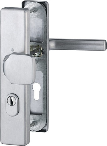 für Abschlusstüren · geprüft nach DIN 18257 · Stahl-Unterkonstruktion im Außen- und Innenschild · mit Rückholfeder-Paket · mit feststehendem Knopf · ZA aus gehärtetem Stahl für vorstehende Zylinderlänge 10-18 mm · mit Schnellstiftverbindung · hochfeste, verdeckte Verschraubung · Lochung PZ · Edelstahl matt · DIN links / rechts · Widerstandsklasse ES 1 · Weitere technische Eigenschaften Breite: 54mm • Länge: 250mm • Abdeckung: mit Zylinderabdeckung • Schildstärke: 15 mm • Farb-Nr.: F69