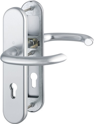 Aluminium-Schutz-Langschild-Garnitur für Außen-/Wohnungsabschluss-Türen · geprüft nach DIN EN 1906: 37-0142A (SK2) , zertifiziert nach DIN 18257 ES1 , Objekt-Garnitur (Gebrauchs-Kategorie 3) · Lagerung: Türgriffe lose (Wechselgarnitur: außen gekröpfter Knopf fest, ummontierbar), Rückholfeder rechts/links verwendbar, wartungsfreies Gleitlager · Verbindung: HOPPE- Schnellstift mit HOPPE-Vollstift (Drückergrt., Stift-/Lochteil) / HOPPE-FDW-Vollstift (Wechselgrt., Lochteil) · Unterkonstruktion: außen Stahl, innen Zamak, Stütznocken · Befestigung: innen sichtbar, durchgehend, Gewindeschrauben M6 · Widerstandsklasse ES 1 · Weitere technische Eigenschaften Breite: 54mm • Länge: 250mm • Abdeckung: ohne Zylinderabdeckung • Schildstärke: 12 mm • Farb-Nr.: F1