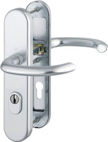 Aluminium-Schutz-Langschild-Garnitur mit Zylinderabdeckung für Außen-/Wohnungsabschluss-Türen · geprüft nach DIN EN 1906: 37-0142A (SK2) , zertifiziert nach DIN 18257 ES1 , Objekt-Garnitur (Gebrauchs-Kategorie 3) · Lagerung: Türgriffe lose (Wechselgarnitur: außen gekröpfter Knopf fest, ummontierbar), Rückholfeder rechts/links verwendbar, wartungsfreies Gleitlager · Verbindung: HOPPE- Schnellstift mit HOPPE-Vollstift (Drückergrt., Stift-/Lochteil) / HOPPE-FDW-Vollstift (Wechselgrt., Lochteil) · Zylinder-Abdeckung: gehärteter Stahl, für vorstehende Zylinderlänge 10-18 mm · Unterkonstruktion: außen Stahl, innen Zamak, Stütznocken · Befestigung: innen sichtbar, durchgehend, Gewindeschrauben M6 Widerstandsklasse ES 1 · Weitere technische Eigenschaften Breite: 54mm • Länge: 250mm • Abdeckung: mit Zylinderabdeckung • Schildstärke: 15 mm • Farb-Nr.: F1