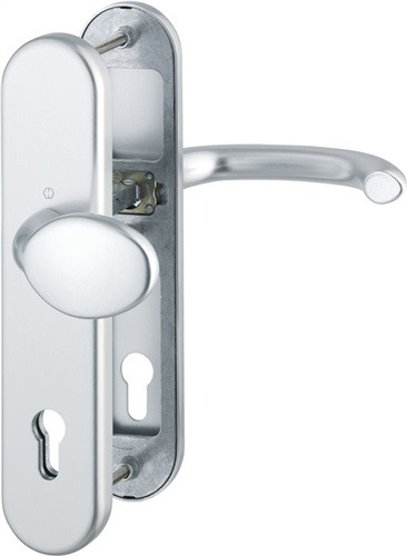 Aluminium-Schutz-Langschild-Garnitur für Außen-/Wohnungsabschluss-Türen · geprüft nach DIN EN 1906: 37-0142A (SK2) , zertifiziert nach DIN 18257 ES1 , Objekt-Garnitur (Gebrauchs-Kategorie 3) · Lagerung: Türgriffe lose (Wechselgarnitur: außen gekröpfter Knopf fest, ummontierbar), Rückholfeder rechts/links verwendbar, wartungsfreies Gleitlager · Verbindung: HOPPE- Schnellstift mit HOPPE-Vollstift (Drückergrt., Stift-/Lochteil) / HOPPE-FDW-Vollstift (Wechselgrt., Lochteil) · Unterkonstruktion: außen Stahl, innen Zamak, Stütznocken · Befestigung: innen sichtbar, durchgehend, Gewindeschrauben M6 · Widerstandsklasse ES 1 · Weitere technische Eigenschaften Breite: 54mm • Länge: 250mm • Abdeckung: ohne Zylinderabdeckung • Schildstärke: 12 mm • Ergänzung: abgesetzter Vierkant • Farb-Nr.: F1