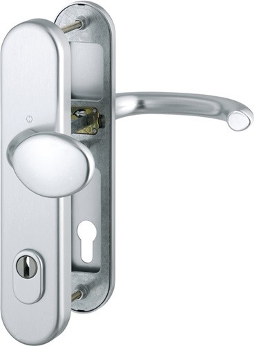 Aluminium-Schutz-Langschild-Garnitur mit Zylinderabdeckung für Außen-/Wohnungsabschluss-Türen · geprüft nach DIN EN 1906: 37-0142A (SK2) , zertifiziert nach DIN 18257 ES1 , Objekt-Garnitur (Gebrauchs-Kategorie 3) · Lagerung: Türgriffe lose (Wechselgarnitur: außen gekröpfter Knopf fest, ummontierbar), Rückholfeder rechts/links verwendbar, wartungsfreies Gleitlager · Verbindung: HOPPE- Schnellstift mit HOPPE-Vollstift (Drückergrt., Stift-/Lochteil) / HOPPE-FDW-Vollstift (Wechselgrt., Lochteil) · Zylinder-Abdeckung: gehärteter Stahl, für vorstehende Zylinderlänge 10-18 mm · Unterkonstruktion: außen Stahl, innen Zamak, Stütznocken · Befestigung: innen sichtbar, durchgehend, Gewindeschrauben M6 Widerstandsklasse ES 1 · Weitere technische Eigenschaften Breite: 54mm • Länge: 250mm • Abdeckung: mit Zylinderabdeckung • Schildstärke: 15 mm • Ergänzung: abgesetzter Vierkant • Farb-Nr.: F1