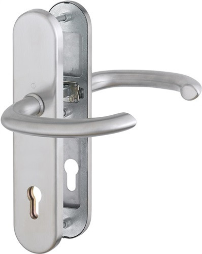 Edelstahl-Schutz-Langschild-Garnitur für Außen-/Wohnungsabschluss-Türen · geprüft nach DIN EN 1906: 37-0142A (SK2) , zertifiziert nach DIN 18257 ES1 , Objekt-Garnitur (Gebrauchs-Kategorie 3) · Lagerung: Türgriffe lose (Wechselgarnitur: außen gekröpfter Knopf fest, ummontierbar), Rückholfeder rechts/links verwendbar, wartungsfreies Gleitlager · Verbindung: HOPPE- Schnellstift mit HOPPE-Vollstift (Drückergrt., Stift-/Lochteil) / HOPPE-FDW-Vollstift (Wechselgrt., Lochteil) · Unterkonstruktion: außen Stahl, innen Zamak, Stütznocken · Befestigung: innen sichtbar, durchgehend, Gewindeschrauben M6 · Anschlagrichtung DIN links /rechts · Lochung PZ · Widerstandsklasse ES 1 · Weitere technische Eigenschaften Breite: 54mm • Länge: 250mm • Abdeckung: ohne Zylinderabdeckung • Schildstärke: 12 mm • Ergänzung: abgesetzter Vierkant • Farb-Nr.: F69