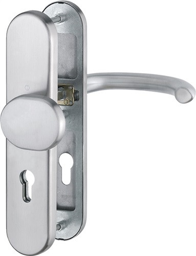 Edelstahl-Schutz-Langschild-Garnitur für Außen-/Wohnungsabschluss-Türen · geprüft nach DIN EN 1906: 37-0142A (SK2) , zertifiziert nach DIN 18257 ES1 , Objekt-Garnitur (Gebrauchs-Kategorie 3) · Lagerung: Türgriffe lose (Wechselgarnitur: außen gekröpfter Knopf fest, ummontierbar), Rückholfeder rechts/links verwendbar, wartungsfreies Gleitlager · Verbindung: HOPPE- Schnellstift mit HOPPE-Vollstift (Drückergrt., Stift-/Lochteil) / HOPPE-FDW-Vollstift (Wechselgrt., Lochteil) · Unterkonstruktion: außen Stahl, innen Zamak, Stütznocken · Befestigung: innen sichtbar, durchgehend, Gewindeschrauben M6 · Anschlagrichtung DIN links /rechts · Lochung PZ · Widerstandsklasse ES 1 · Weitere technische Eigenschaften Breite: 54mm • Länge: 250mm • Abdeckung: ohne Zylinderabdeckung • Schildstärke: 12 mm • Farb-Nr.: F69