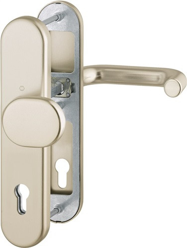 Wechselgarnitur · für Abschlusstüren · einbruchhemmend nach DIN 18257 · Knopfschild-Randhöhe: 12 mm · Stahlunterkonstruktion im Innen- und Außenschild · mit Rückholfeder-Paket · mit Schnellstift-Verbindung · DIN links / rechts verwendbar · hochfeste, verdeckte Verschraubung · einschließlich Befestigungsmaterial · Lochung PZ · Widerstandsklasse ES 1 · Weitere technische Eigenschaften Breite: 54mm • Länge: 250mm • Abdeckung: ohne Zylinderabdeckung • Schildstärke: 12 mm • Ergänzung: abgesetzter Vierkant • Farb-Nr.: F2