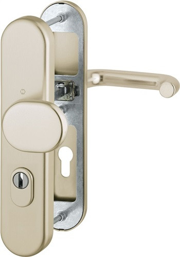 Wechselgarnitur · für Abschlusstüren · einbruchhemmend nach DIN 18257 · Knopfschild-Randhöhe: 12 mm · Stahlunterkonstruktion im Innen- und Außenschild · mit Rückholfeder-Paket · mit Schnellstift-Verbindung · DIN links / rechts verwendbar · hochfeste, verdeckte Verschraubung · einschließlich Befestigungsmaterial · Lochung PZ · Widerstandsklasse ES 1 · Weitere technische Eigenschaften Breite: 54mm • Länge: 250mm • Abdeckung: mit Zylinderabdeckung • Schildstärke: 15 mm • Farb-Nr.: F2