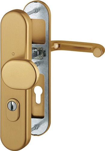 Wechselgarnitur · für Abschlusstüren · einbruchhemmend nach DIN 18257 · Knopfschild-Randhöhe: 12 mm · Stahlunterkonstruktion im Innen- und Außenschild · mit Rückholfeder-Paket · mit Schnellstift-Verbindung · DIN links / rechts verwendbar · hochfeste, verdeckte Verschraubung · einschließlich Befestigungsmaterial · Lochung PZ · Widerstandsklasse ES 1 · Weitere technische Eigenschaften Breite: 54mm • Länge: 250mm • Abdeckung: mit Zylinderabdeckung • Schildstärke: 15 mm • Farb-Nr.: F4