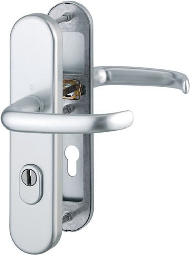 für Abschlusstüren · Stahl-Unterkonstruktion um Außen- und Zamak-Unterkonstruktion im Innenschild · außen: gekröpfter, feststehender Knopf · mit Rückholfeder · innen: loser Türgriff · Schnellstift-Verbindung (mit Hoppe FDW-Vollstift) · ZA aus gehärtetem Stahl für vorstehende Zylinderlänge 10 - 18 mm · verdeckt, durchgehende Verschraubung · Lochung PZ · DIN links / rechts · Widerstandsklasse ES 1 · Weitere technische Eigenschaften Breite: 54mm • Länge: 250mm • Abdeckung: mit Zylinderabdeckung • Schildstärke: 15 mm • Farb-Nr.: F1
