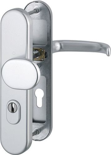 für Abschlusstüren · Stahl-Unterkonstruktion um Außen- und Zamak-Unterkonstruktion im Innenschild · außen: gekröpfter, feststehender Knopf · mit Rückholfeder · innen: loser Türgriff · Schnellstift-Verbindung (mit Hoppe FDW-Vollstift) · ZA aus gehärtetem Stahl für vorstehende Zylinderlänge 10 - 18 mm · verdeckt, durchgehende Verschraubung · Lochung PZ · DIN links / rechts · Widerstandsklasse ES 1 · Weitere technische Eigenschaften Breite: 54mm • Länge: 250mm • Abdeckung: mit Zylinderabdeckung • Schildstärke: 15 mm • Farb-Nr.: F1