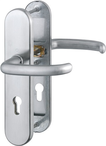für Abschlusstüren · Stahl-Unterkonstruktion um Außen- und Zamak-Unterkonstruktion im Innenschild · mit Rückholfeder · Türgriffe mit Schnellstift-Verbindung (mit Hoppe FDW-Vollstift) · verdeckt, durchgehende Verschraubung · Weitere technische Eigenschaften Breite: 54mm • Länge: 250mm • Abdeckung: ohne Zylinderabdeckung • Schildstärke: 12 mm • Farb-Nr.: F69