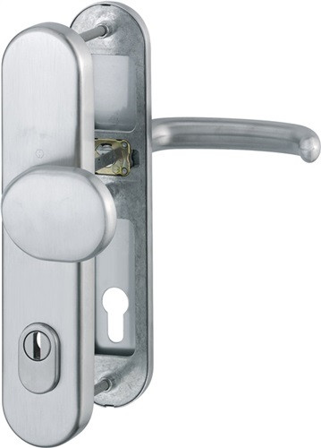 für Abschlusstüren · Stahl-Unterkonstruktion um Außen- und Zamak-Unterkonstruktion im Innenschild · außen: gekröpfter, feststehender Knopf · mit Rückholfeder · innen: loser Türgriff · Schnellstift-Verbindung (mit Hoppe FDW-Vollstift) · ZA aus gehärtetem Stahl für vorstehende Zylinderlänge 10 - 18 mm · verdeckt, durchgehende Verschraubung · Lochung PZ · DIN links / rechts · Widerstandsklasse ES 1 · Weitere technische Eigenschaften Breite: 54mm • Länge: 250mm • Abdeckung: mit Zylinderabdeckung • Schildstärke: 15 mm • Ergänzung: abgesetzter Vierkant • Farb-Nr.: F69