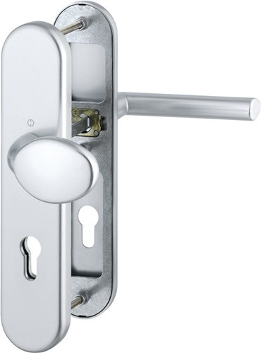 für Abschlusstüren · geprüft nach DIN 18257 · Stahl-Unterkonstruktion im Außen- und Zamak-Unterkonstruktion im Innenschild · mit Rückholfeder-Paket · Wechselgarnituren mit gekröpftem Knopf · feststehend (ummontierbar) · mit Schnellstift-Verbindung · hochfeste, verdeckte Verschraubung · Lochung PZ · einschließlich Befestigungsmaterial M 6 · DIN links / rechts · Widerstandsklasse ES 1 · Weitere technische Eigenschaften Breite: 54mm • Länge: 250mm • Abdeckung: ohne Zylinderabdeckung • Schildstärke: 12 mm • Farb-Nr.: F1