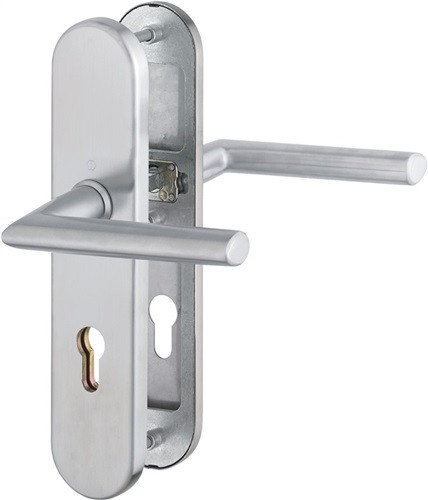 für Abschlusstüren · geprüft nach DIN 18257 · Stahl-Unterkonstruktion im Außen- und Innenschild mit Rückholfeder-Paket · Wechselgarnituren mit gekröpftem Knopf · feststehend (ummontierbar) · mit Schnellstift-Verbindung · hochfeste, verdeckte Verschraubung · Lochung PZ · einschließlich Befestigungsmaterial M 6 · DIN links / rechts · Widerstandsklasse ES 1 · Weitere technische Eigenschaften Breite: 54mm • Länge: 250mm • Abdeckung: ohne Zylinderabdeckung • Schildstärke: 12 mm • Farb-Nr.: F69