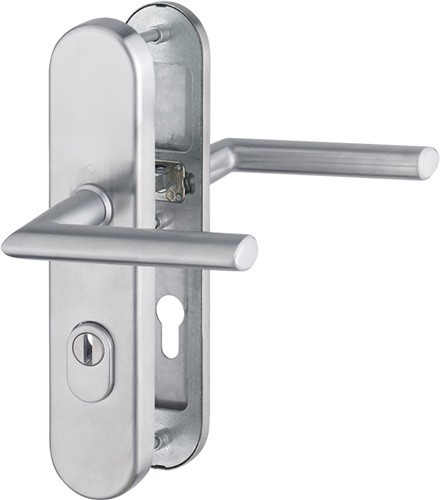 für Abschlusstüren mit ZA · geprüft nach DIN 18257 · Stahl-Unterkonstruktion im Außen- und Innenschild · mit Rückholfeder-Paket · Wechselgarnituren mit gekröpftem Knopf · feststehend (ummontierbar) · ZA aus gehärtetem Stahl für vorstehende Zylinderlänge 10-18 mm · mit Schnellstift-Verbindung · hochfeste, verdeckte Verschraubung · Lochung PZ · einschließlich Befestigungsmaterial M 6 · DIN links / rechts · Widerstandsklasse ES 1 · Weitere technische Eigenschaften Breite: 54mm • Länge: 250mm • Abdeckung: mit Zylinderabdeckung • Schildstärke: 15 mm • Farb-Nr.: F69