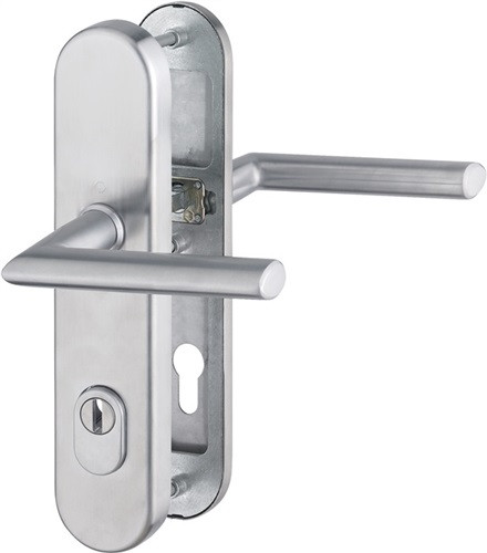 für Abschlusstüren mit ZA · geprüft nach DIN 18257 · Stahl-Unterkonstruktion im Außen- und Innenschild · mit Rückholfeder-Paket · Wechselgarnituren mit gekröpftem Knopf · feststehend (ummontierbar) · ZA aus gehärtetem Stahl für vorstehende Zylinderlänge 10-18 mm · mit Schnellstift-Verbindung · hochfeste, verdeckte Verschraubung · Lochung PZ · einschließlich Befestigungsmaterial M 6 · DIN links / rechts · Widerstandsklasse ES 1 · Weitere technische Eigenschaften Breite: 54mm • Länge: 250mm • Abdeckung: mit Zylinderabdeckung • Schildstärke: 15 mm • Ergänzung: abgesetzter Vierkant • Farb-Nr.: F69