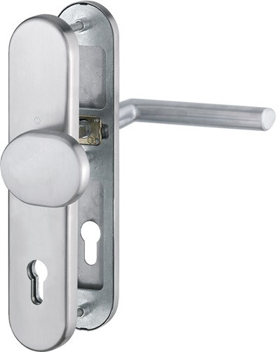 für Abschlusstüren · geprüft nach DIN 18257 · Stahl-Unterkonstruktion im Außen- und Innenschild mit Rückholfeder-Paket · Wechselgarnituren mit gekröpftem Knopf · feststehend (ummontierbar) · mit Schnellstift-Verbindung · hochfeste, verdeckte Verschraubung · Lochung PZ · einschließlich Befestigungsmaterial M 6 · DIN links / rechts · Widerstandsklasse ES 1 · Weitere technische Eigenschaften Breite: 54mm • Länge: 250mm • Abdeckung: ohne Zylinderabdeckung • Schildstärke: 12 mm • Ergänzung: abgesetzter Vierkant • Farb-Nr.: F69