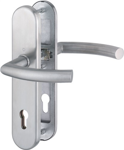 für Abschlusstüren · geprüft nach DIN 18257 · Stahl-Unterkonstruktion im Außen- und Innenschild · mit Rückholfeder-Paket · Wechselgarnituren mit gekröpftem Knopf · feststehend (ummontierbar) · mit Schnellstift-Verbindung · hochfeste, verdeckte Verschraubung · Lochung PZ · einschließlich Befestigungsmaterial M 6 · Anschlagrichtung DIN links / rechts · Widerstandsklasse ES 1 · Weitere technische Eigenschaften Breite: 54mm • Länge: 250mm • Abdeckung: ohne Zylinderabdeckung • Schildstärke: 12 mm • Ergänzung: abgesetzter Vierkant • Farb-Nr.: F69