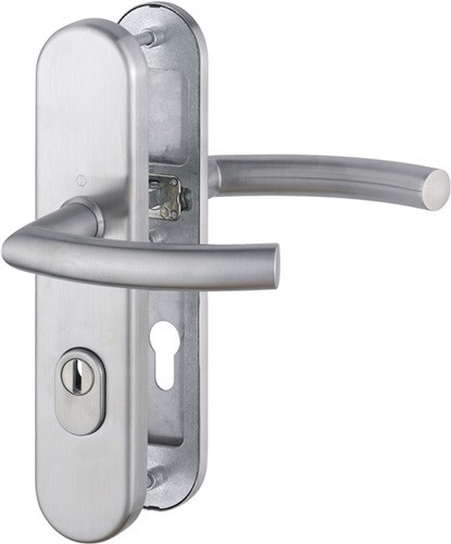 für Abschlusstüren mit ZA · geprüft nach DIN 18257 · Stahl-Unterkonstruktion im Außen- und Innenschild mit Rückholfeder-Palet · Wechselgarnituren mit gekröpftem Knopf · feststehend (ummontierbar) · ZA aus gehärtetem Stahl für vorstehende Zylinderlänge 10-18 mm · mit Schnellstift-Verbindung · hochfeste, verdeckte Verschraubung · PZ · einschließlich Befestigungsmaterial M 6 · DIN links / rechts · Widerstandsklasse ES 1 · Weitere technische Eigenschaften Breite: 54mm • Länge: 250mm • Abdeckung: mit Zylinderabdeckung • Schildstärke: 15 mm • Farb-Nr.: F69