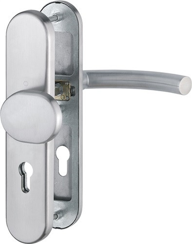 für Abschlusstüren · geprüft nach DIN 18257 · Stahl-Unterkonstruktion im Außen- und Innenschild · mit Rückholfeder-Paket · Wechselgarnituren mit gekröpftem Knopf · feststehend (ummontierbar) · mit Schnellstift-Verbindung · hochfeste, verdeckte Verschraubung · Lochung PZ · einschließlich Befestigungsmaterial M 6 · Anschlagrichtung DIN links / rechts · Widerstandsklasse ES 1 · Weitere technische Eigenschaften Breite: 54mm • Länge: 250mm • Abdeckung: ohne Zylinderabdeckung • Schildstärke: 12 mm • Farb-Nr.: F69