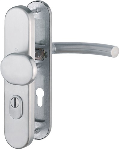 für Abschlusstüren mit ZA · geprüft nach DIN 18257 · Stahl-Unterkonstruktion im Außen- und Innenschild mit Rückholfeder-Palet · Wechselgarnituren mit gekröpftem Knopf · feststehend (ummontierbar) · ZA aus gehärtetem Stahl für vorstehende Zylinderlänge 10-18 mm · mit Schnellstift-Verbindung · hochfeste, verdeckte Verschraubung · PZ · einschließlich Befestigungsmaterial M 6 · DIN links / rechts · Widerstandsklasse ES 1 · Weitere technische Eigenschaften Breite: 54mm • Länge: 250mm • Abdeckung: mit Zylinderabdeckung • Schildstärke: 15 mm • Farb-Nr.: F69