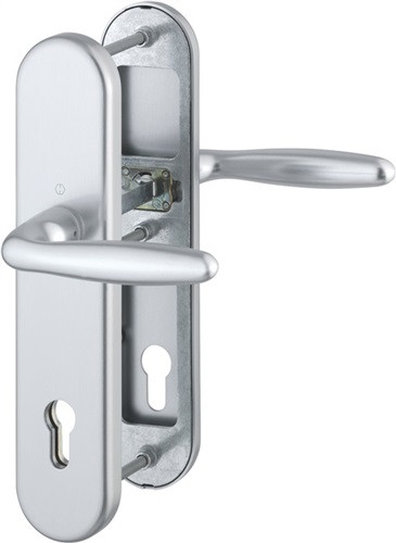für Abschlusstüren · einbruchhemmend nach DIN 18257 · Stahl-Unterkonstruktion im Außen- und Innenschild · mit Rückholfeder-Paket · außen: gekröpfter, feststehender Kopf (ummontierbar) · innen: loser Türgriff, mit Schnellstift-Verbindung · hochfeste, verdeckte Verschraubung · Knopfschild-Randhöhe: 12 mm · Wechselgarnitur · DIN links / rechts · Widerstandsklasse ES 1 · Weitere technische Eigenschaften Breite: 54mm • Länge: 250mm • Abdeckung: ohne Zylinderabdeckung • Schildstärke: 12 mm • Ergänzung: abgesetzter Vierkant • Farb-Nr.: F1