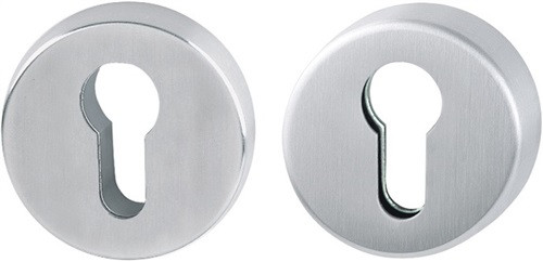 Edelstahl-Schutz-Schlüsselrosetten-Paar für Außentüren · Unterkonstruktion: außen Zamak, innen Stahl, Stütznocken · Befestigung: verdeckt, durchgehend, Gewindeschrauben M5 · Stärke 15 mm · Ø 55 mm · Lochung PZ · für Türstärke 57-62 mm + 67-72 mm Variante mit ZA: Stahl, für vorstehende Zylinderlänge 10-18 mm · Weitere technische Eigenschaften Lochung: PZ