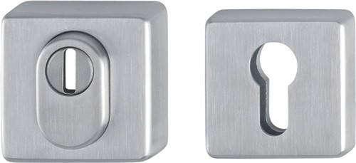 Edelstahl-Schutz-Schlüsselrosetten-Paar für Außentüren · Unterkonstruktion: außen Zamak, innen Stahl, Stütznocken · Befestigung: verdeckt, durchgehend, Gewindeschrauben M5 · Stärke 15 mm · Ø 55 mm · Lochung PZ · für Türstärke 57-62 mm + 67-72 mm · Breite 55 mm · Höhe 55 mm Variante mit ZA: Stahl, für vorstehende Zylinderlänge 10-18 mm · Weitere technische Eigenschaften Lochung: PZ
