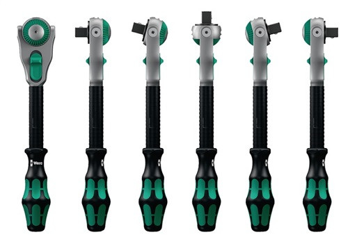 6,3 mm (1/4 ″)-Vierkantantrieb · mit Schwungmassenkonstruktion und griffiger Schnelldrehhülse für hohe Arbeitsgeschwindigkeiten · mit Kugelarretierung · schnelle Rechts-Links-Umschaltung · feinverzahnt · mit ergonomischem Mehrkomponentengriff · Besondere Produktvorteile: · frei schwenkbarer Knarrenkopf · definierte Stellung bei 0°, 90° nach links und rechts sowie 15° von 90° nach innen · in 0° -Stellung einsetzbar wie ein konventioneller Schraubendreher · Druckknopfauslösung · mit Mehrkomponenten-Kraftform-Griff · vereinigt die Vorteile von 6 Werkzeugen in einer Knarre Rückschwenkwinkel 5° 72 Zähne