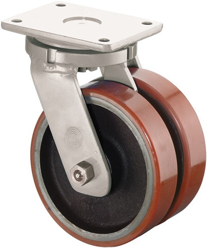 Doppel-Lenkrolle · schwere Stahlschweißkonstruktion · verzinkt · Kugellager im Gabelkopf · Räder: mit Gussfelge, Bandage aus Gusspolyurethan 95 +/-3 Shore A, Farbe Bandage braun, Kugellager in der Radnabe · beständig gegen Benzin, Diesel, Öle sowie pflanzliche und tierische Fette · Weitere technische Eigenschaften Oberfläche Gehäuse: verzinkt-chromatiert • Schraubloch-Ø: 16mm • Ausladung: 107mm • Schraublochentfernung: 210 x 160mm • Material Gehäuse: Stahlblech