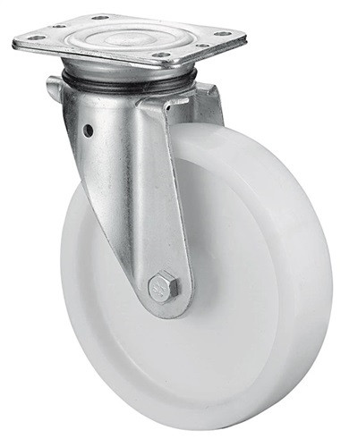schwere Transportgeräterolle · Stahlblechgehäuse, verzinkt-chromatiert · zweireihiges Kugellager im Gabelkopf · Rad aus Kunststoff (naturfarben) · korrosionsunempfindlich · beständig gegen Benzin, Diesel, Öle sowie pflanzliche und tierische Fette · Radachse verschraubt · Rollenlager · Weitere technische Eigenschaften Schraubloch-Ø: 11mm • Befestigungsart: mit Anschraubplatte • Schraublochentfernung: 105 x 75mm