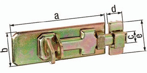 mit flachem Griff bei vorgeschobenem Schieber sind die versenkten Schraublöcher der Riegelplatte abgedeckt, so dass ein Abschrauben unmöglich ist · die Schlaufe ist durch eine Einschlaglasche gesichert, die durch den vorgeschobenen Schieber verdeckt wird · Material: Stahl, Oberfläche: galvanisch gelb verzinkt mit befestigter Schlaufe · Weitere technische Eigenschaften Oberfläche: galvanisch gelb verzinkt • Maß c: 13mm • Maß d: 18mm • Maß e: 41mm • Maß a: 80mm • Maß b: 35mm