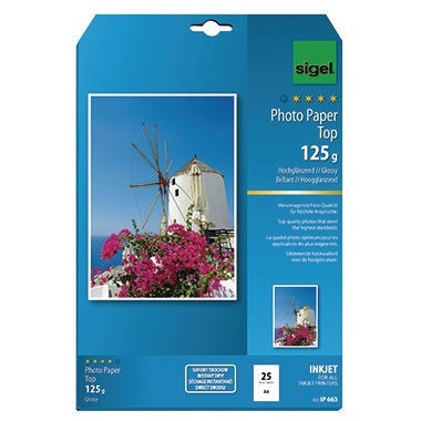 Das Fotopapier Top liefert brillante Bildqualität und erstklassige Farbintensität. Durch die schnelle Tintenaufnahme ist das Papier sofort trocken und absolut wischfest. Es eignet sich perfekt für die Vervielfältigung, Vergrößerung und Weitergabe von ausdrucksstarken Fotos. Ein Download der Sigel Gestaltungssoftware, Enjoy your Photo, steht Ihnen kostenlos zur Verfügung. · beidseitig beschichtet: Ja · Farbe: hochweiß · Verwendung für Druck- oder Schreibgerät: Inkjetdrucker · Papierformat: DIN A4 · Maße: 21 x 29,7 cm (B x H) · Anzahl der Blätter je Packung: 25 Bl./Pack. · Ausführung der Oberflächenbeschaffenheit: hochglänzend · Ausführung der Kanten: glatt · Auflösung des Druckbildes: 9.600 dpi · Anzahl der Fotos je Blatt: 1 Foto/Bl. · beidseitig bedruckbar: Nein · Grammatur: 125 g/m²