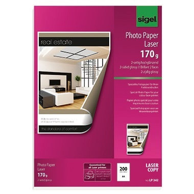 Dieses Fotopapier von Sigel ist speziell für den Farblaserdrucker konzipiert. Ihre farbig gedruckten Flyer, Präsentationen und Angebote erhalten mit dem hochglänzenden Papier einen professionellen Look. Brillante Farben und hohe Detailgenauigkeit werden den Betrachter beeindrucken. · beidseitig bedruckbar: Ja · Verwendung für Druck- oder Schreibgerät: Farblaserdrucker, Farbkopierer · Papierformat: DIN A4 · Maße: 21 x 29,7 cm (B x H) · Grammatur: 170 g/m² · beidseitig beschichtet: Ja · Ausführung des Papiertyps: elementar chlorfrei gebleicht · Ausführung der Oberflächenbeschaffenheit: hochglänzend · Anzahl der Fotos je Blatt: 1 Foto/Bl. · Anzahl der Blätter je Packung: 200 Bl./Pack. · Farbe: hochweiß