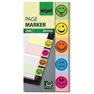 Smilies auf Haftmarkerstreifen. · beschriftbar: Ja · wieder ablösbar: Ja · Werkstoff: Papier · Maße: 20 x 50 mm (B x H) · Höhe: 100 mm · Grammatur: 80 g/m² · Farbe: 1 x gelb, 1 x orange, 1 x pink, 1 x grün, 1 x blau · Blauer Engel: Nein · Beschreibung der Besonderheiten: Smilies auf Haftmarkerstreifen · Ausführung des Papiertyps: elementar chlorfrei gebleicht · Ausführung des Inhalts (Packung): 5 Block/Pack. · Anzahl der Blätter: 40 Bl./Block · Breite: 50 mm