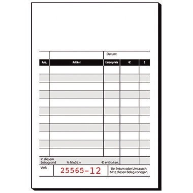 Sigel Kassenblock DIN A6 1 Durchschlag 2 x 50 Bl. · Anzahl der Durchschläge: 1 Durchschlag · Farbe des Durchschlages: weiß · Verwendung für Beschriftungsart: handschriftlich · Typbezeichnung der Perforation: Mikroperforation · selbstdurchschreibend: Ja · Papierformat: DIN A6 · Grammatur: 52 g/m² · Ausführung der MwSt.: MwSt. separat ausweisbar · Ausführung der Bindung: Klammerbindung · Zeilennummerierung vorhanden: Nein · Anzahl der Blaupapiere: 1 Blaupapier · Anzahl der Blätter: 2 x 50 Bl. · Abheftlochung vorhanden: Nein · Ausführung der Lieferzusammenstellung: inkl. Additionsblatt