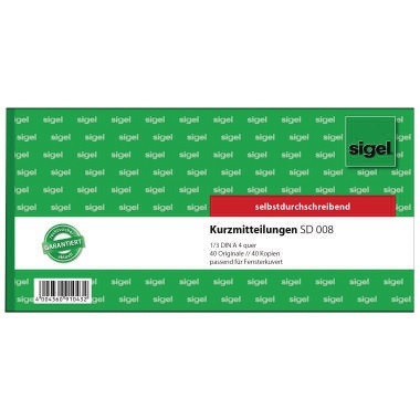 Hohe Verarbeitungsqualität und Funktionalität für einen maximalen Anwendernutzen. Praktische Organisationshilfe fürs Büro und im Alltag, damit es schneller und leichter geht! · selbstdurchschreibend: Ja · Typbezeichnung der Perforation: Mikroperforation · Papierformat: 1/3 DIN A4 quer · Grammatur: 56 g/m² · Forest Stewardship Council (FSC): Ja · Ausführung des Papiertyps: holzfrei, elementar chlorfrei gebleicht · Ausführung der Bindung: Fälzelbindung · Anzahl der Durchschläge: 1 Durchschlag · Abheftlochung vorhanden: Ja · Anzahl der Blätter: 2 x 40 Bl. · Farbe des Durchschlages: gelb · Verwendung für Beschriftungsart: handschriftlich, Schreibmaschine