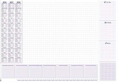 Ansprechende Schreibunterlage aus Papier. Dank der stabilen Leimung an der Unterkante und partiell an der Oberkante wird zuverlässig ein Umknicken der Ecken verhindert. Viel Platz für Ihre persönlichen Notizen. · Grammatur: 80 g/m² · Werkstoff: Papier · Typbezeichnung des Motivs: Lilac · Typbezeichnung der Kalenderaufteilung: Wochenplan · Stärke: 4 mm · recycelbar: Ja · Maße: 59,5 x 41 cm (B x H) · Anzahl der Blätter: 30 Bl. · Höhe: 410 mm · Folienauflage vorhanden: Ja · Farbe: mehrfarbig · Breite: 595 mm · Ausführung der Kalenderaufteilung: 3 Jahre/1 Seite · Kalender vorhanden: Ja